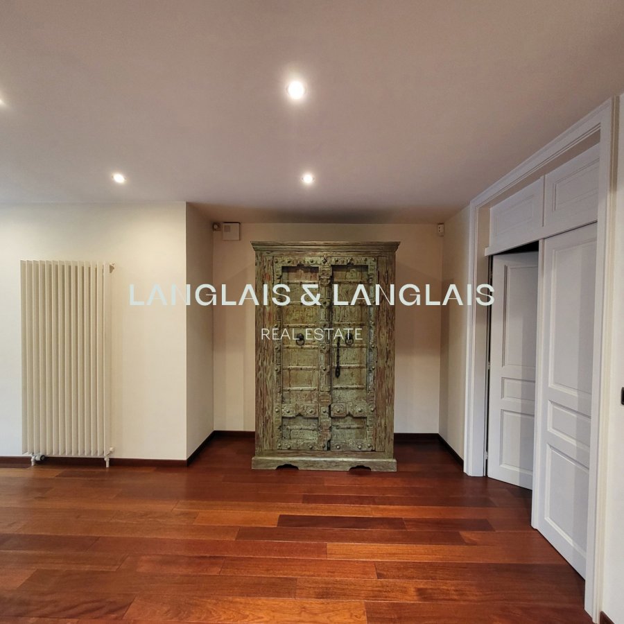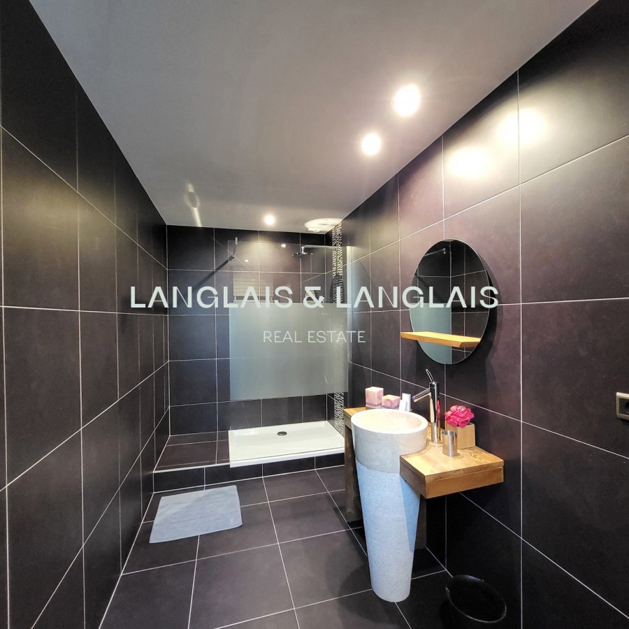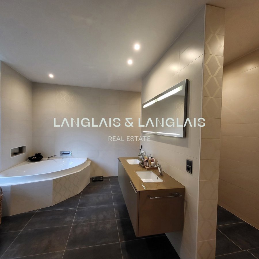 The main floor hosts a 65 m² master suite with custom-made dressing room and private bathroom, along with a second bedroom featuring its own en-suite shower room.